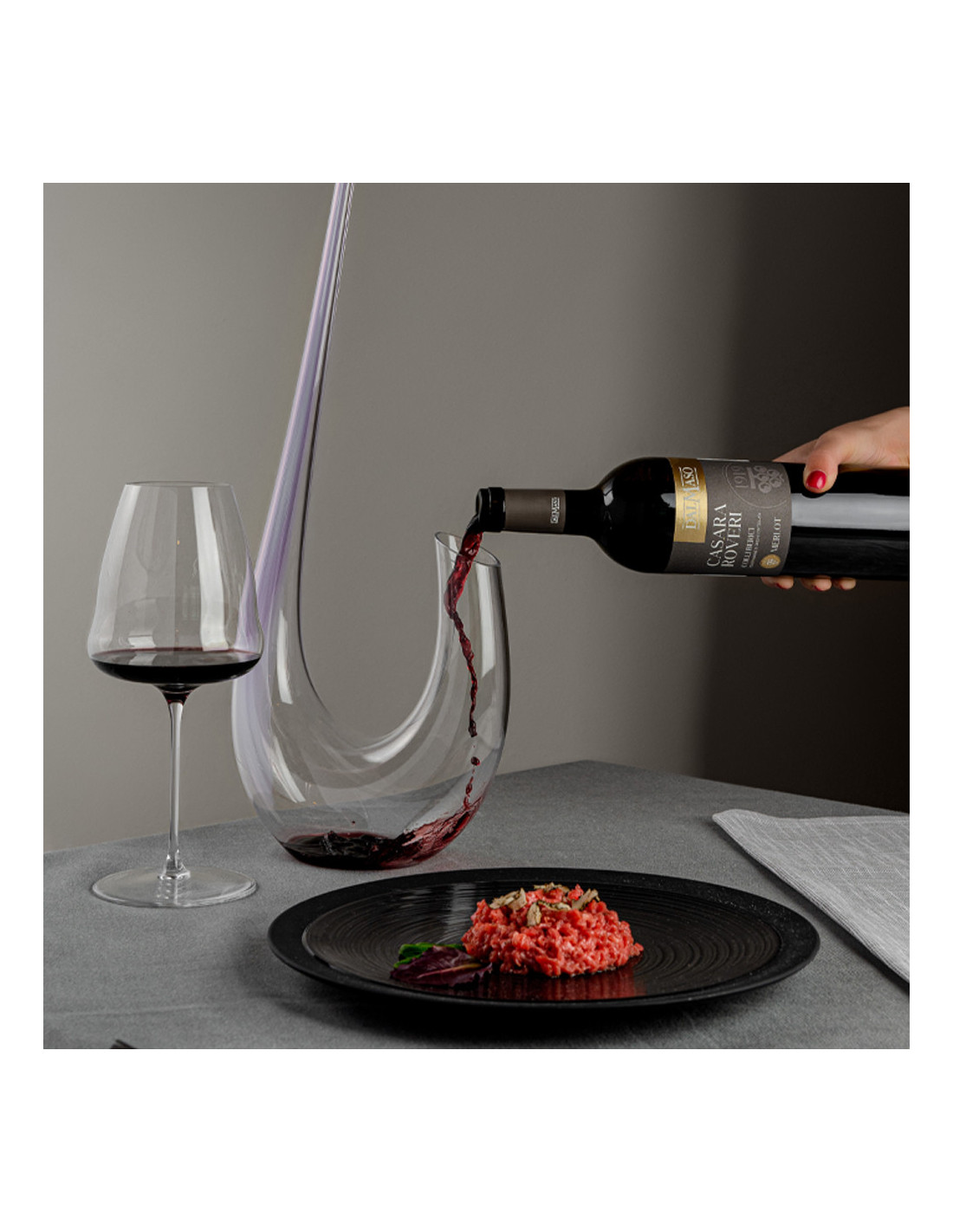 Wine of notable structure obtained from Cabernet Sauvignon and Cabernet Franc grapes. Matured in French oak barriques and in the bottle. Complex and long-aging wine. It shows an intense ruby red. On